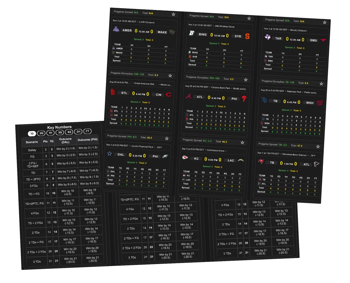 Real-Time Updates - Our database updates as the plays of the game unfold, allowing you to quickly and easily spot bets and advantages.